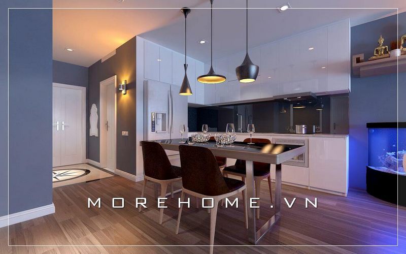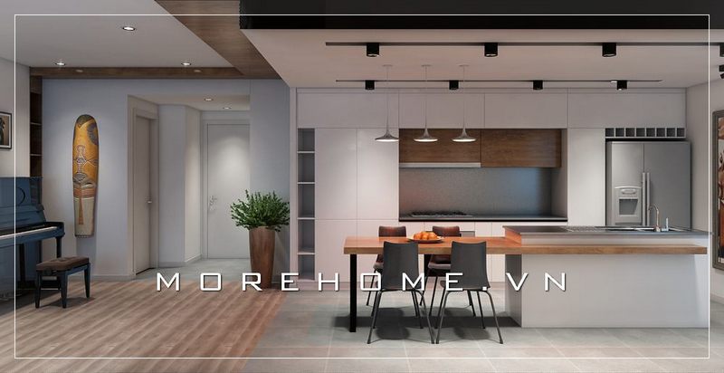 Thiết kế nội thất bếp chung cư và khu vực ăn uống liền kề, không tạo vách ngăn như các thiết kế truyền thống vì vậy mang đến cho không gian sống một sự liền mạch, thống nhất
