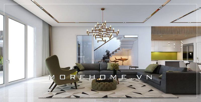 Lựa chọn tuyệt vời cho không gian phòng khách nhà phố, biệt thự hiện đại với thiết kế sofa dạng góc hiện đại bọc da màu xám độc đáo và sang trọng