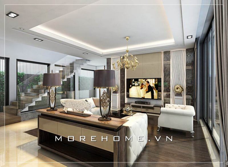 Vẻ đẹp sang trọng từ bộ sofa bọc da sắc trắng cao cấp được thiết kế theo phong cách tân cổ điển nghệ thuật nổi bật trong không gian phòng khách biệt thự, nhà phố