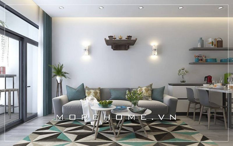 Thiết kế sofa theo phong cách hiện đại kiểu dáng văng ba đơn giản mà tiện lợi, độc đáo với tone xanh mới lạ và chất nhung quyến rũ là trung tâm ấn tượng của nội thất phòng khách căn hộ