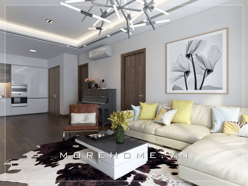 Đầy ấn tượng với màu kem nhẹ nhàng tinh tế của bộ sofa da dạng góc tối ưu không gian phòng khách căn hộ chung cư.