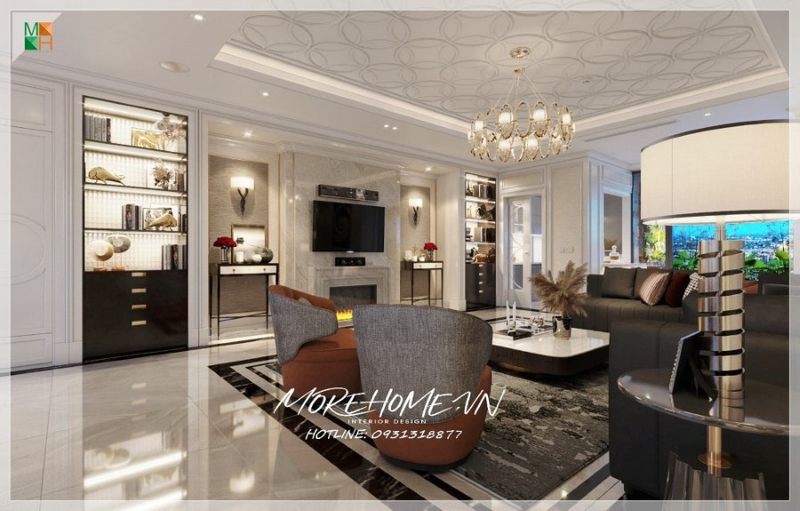 Nội thất hiện đại cùng vẻ cổ điển được kết hợp với những kệ tủ âm tường màu sắc tối giản giúp chủ nhà trang trí đồ vật và là nơi để lưu trữ sách trong phòng khách của căn hộ cao cấp, giúp cho việc tìm kiếm nhanh chóng.